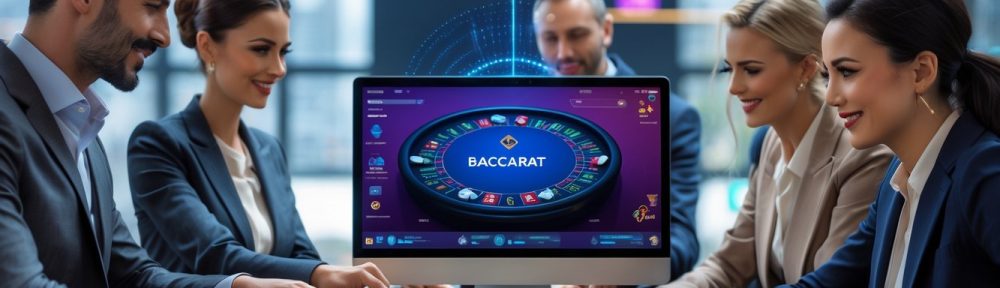Beberapa orang bermain baccarat online di depan komputer di ruangan modern dengan suasana fokus dan antusias.