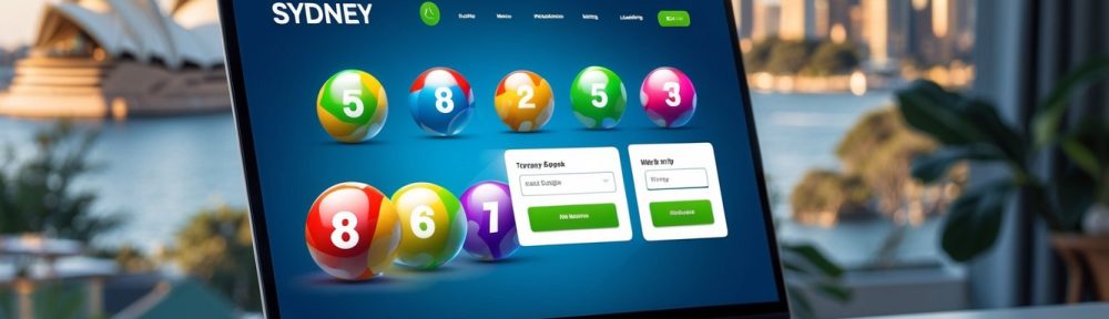 Meja kerja dengan laptop dan ponsel menampilkan antarmuka lotere digital, dengan latar belakang pemandangan kota Sydney yang samar.