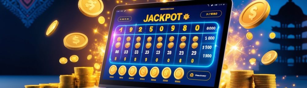 Sebuah perangkat modern menampilkan permainan jackpot progresif online dengan efek digital dan koin berkilau, di latar belakang dengan elemen budaya Indonesia.