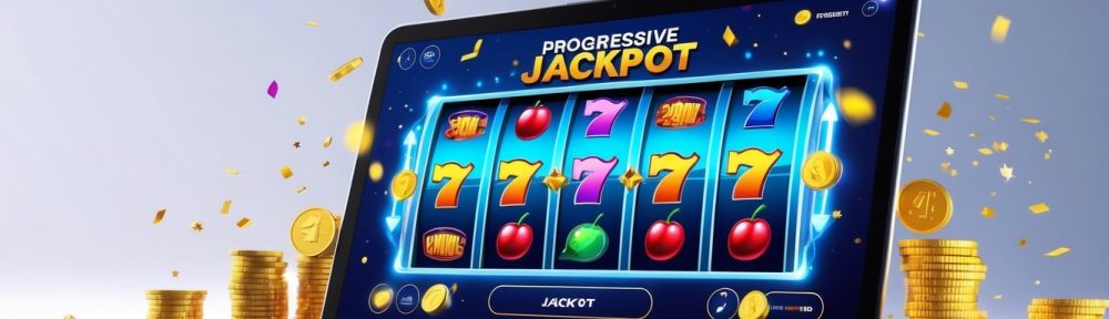 Layar perangkat digital menampilkan permainan jackpot progresif dengan simbol mesin slot dan koin bersinar di sekitarnya.