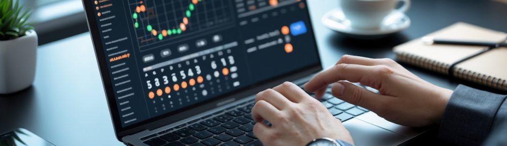 Seorang pria atau wanita menggunakan laptop di meja kerja dengan tangan aktif mengetik, di sekitar meja terdapat ponsel, cangkir kopi, dan buku catatan.