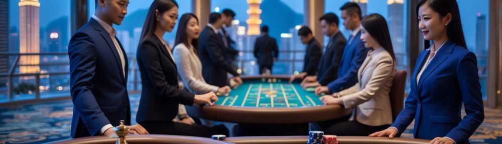 Suasana dalam kasino modern di Macau dengan meja judi dan latar belakang gedung pencakar langit kota.