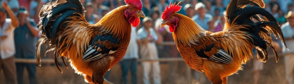 Dua ayam jago sedang bertarung di arena dengan penonton yang antusias di latar belakang.