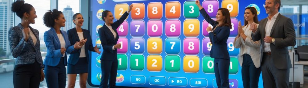 Sekelompok orang di kantor modern yang sedang melihat layar digital dengan angka lotere dan simbol jackpot, dengan pemandangan kota Sydney di latar belakang.