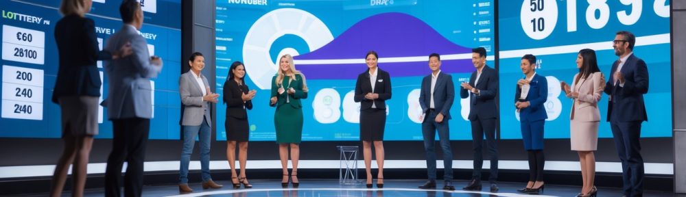 Orang-orang di studio modern sedang memantau hasil undian lotere langsung dengan latar belakang pemandangan Sydney.